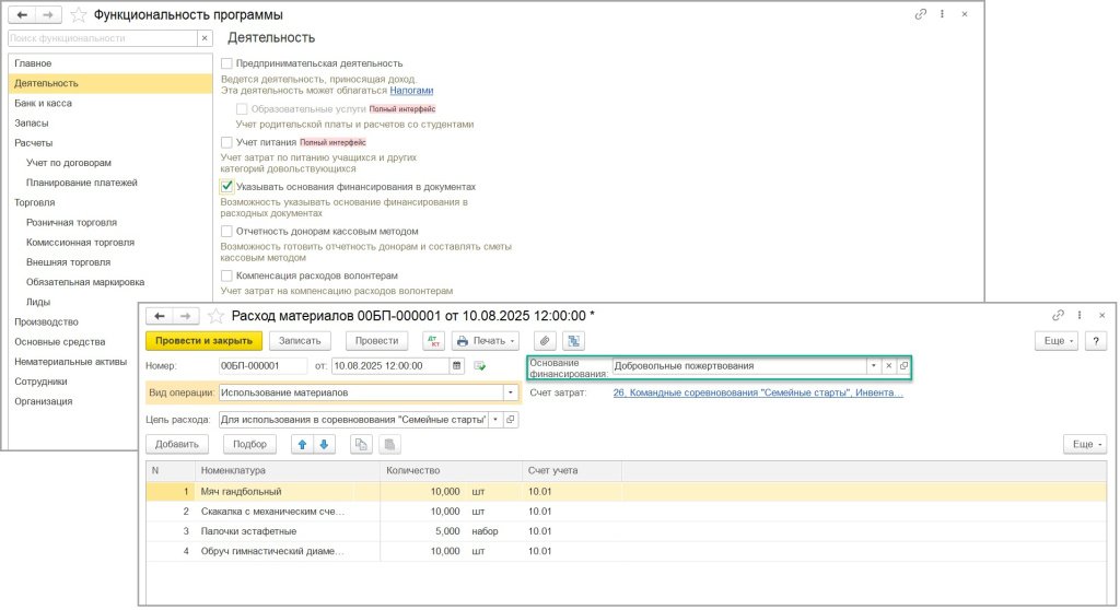 Если средства донора используются на оплату расходов по нескольким направлениям деятельности, необходимо обеспечить раздельный учет трат по основаниям финансирования. В этом случае рекомендуем учитывать расходы по основаниям финансирования сразу в первичных документах (раздел Главное – Функциональность).