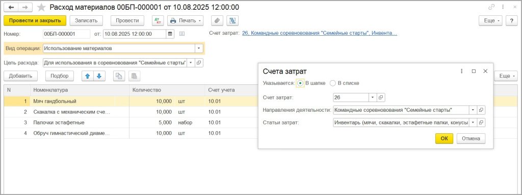 Отразить использование полученных товаров в расходах по целевому финансированию можно с помощью документа Расход материалов (раздел Склад − Расход материалов) с указанием соответствующей аналитики затрат.