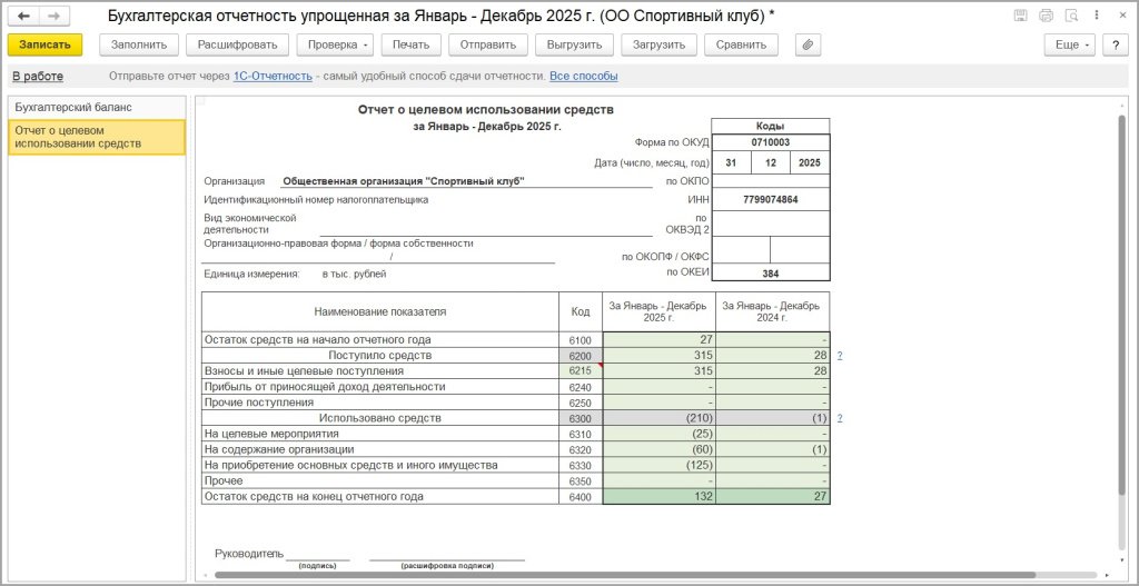 Представлять в составе бухгалтерской отчетности Отчет о целевом использовании средств обязаны все некоммерческие организации. Программа заполняет данный отчет автоматически по данным учета (раздел Отчеты – Регламентированные отчеты).