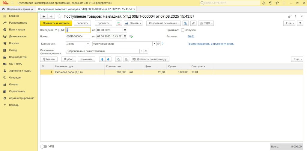 Поступление товаров и услуг, связанных с уставной деятельностью некоммерческой организации, отражается документами Поступление услуг: Акт, УПД и Поступление товаров: Накладная, УПД (раздел Покупки − Поступления (акты, накладные)).