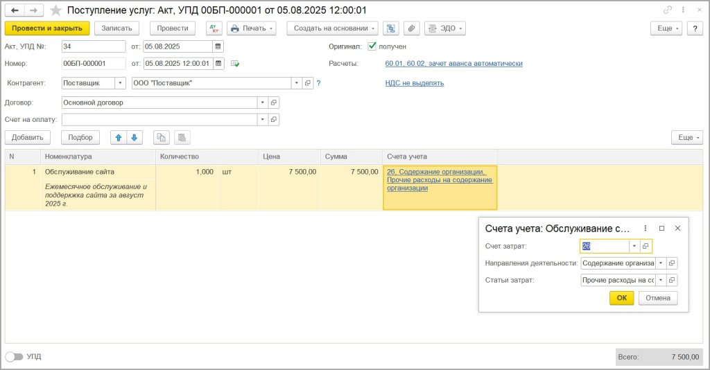 Если поступление является приобретением за плату, то указывается вид контрагента Поставщик и соответствующая аналитика затрат.