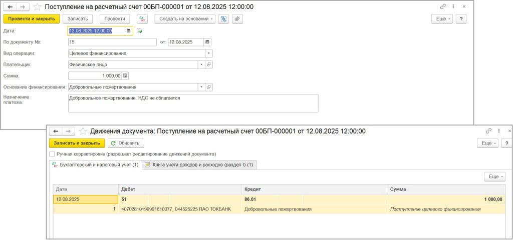 Некоммерческие организации могут получать целевое финансирование на расчетный счет, наличными в кассу, с использованием банковских карт, в том числе через онлайн-платежные системы на их сайтах. Поступление целевого финансирования на расчетный счет отражается документами Поступление на расчетный счет, Поступление наличных, Оплата платежной картой с видом операции Целевое финансирование. В документах указывается плательщик-донор и соответствующее основание финансирования.