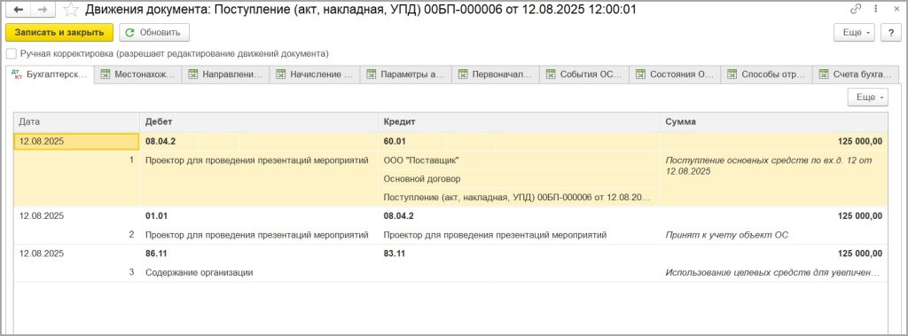 При принятии основных средств к учету (в документах Поступление основных средств и Принятие к учету ОС) необходимо указать Направление деятельности. Это позволит четко проследить целевую направленность выделенных средств, обеспечить корректную аналитику по счету 86 для отнесения расходов и в дальнейшем отчитаться перед донорами об использовании средств строго по назначению.