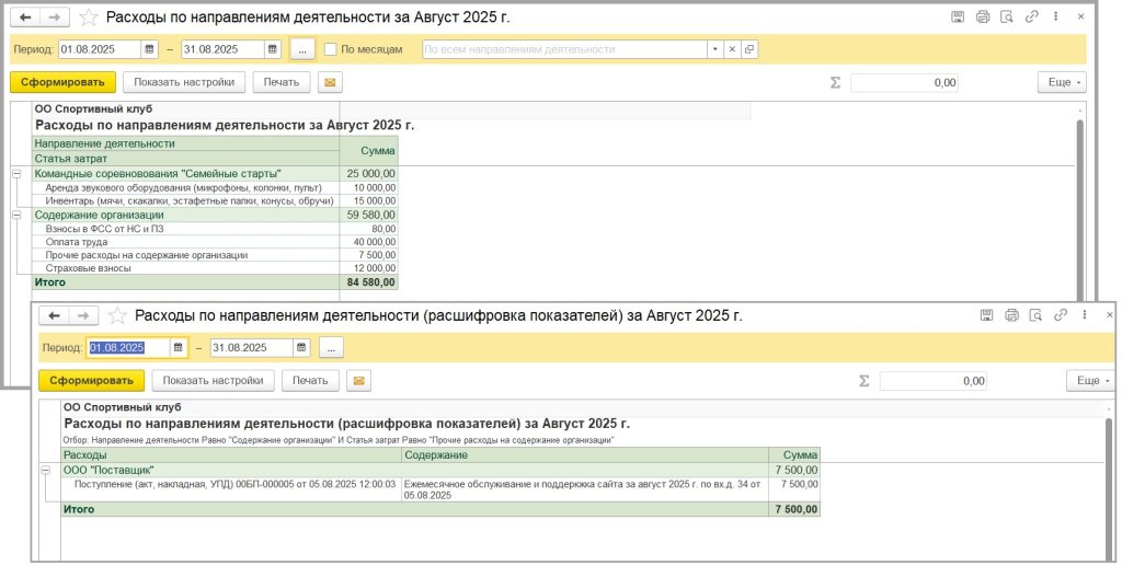 Отчет Расходы по направлению деятельности предназначен не только для расшифровки Отчета об использовании целевых средств, но и работает как отдельный самодостаточный отчет по расходам в разрезе направлений деятельности и статей затрат. Отчет можно детализировать до первичных документов, дважды щелкнув по соответствующей сумме.