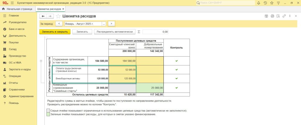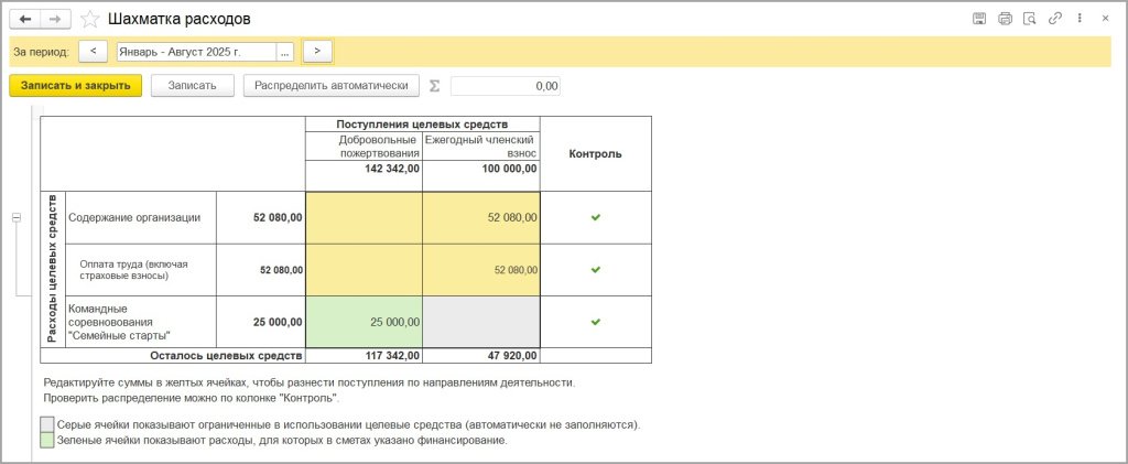 Также в шахматке отдельно показываются расходы, для которых в смете указано финансирование (зеленые ячейки).