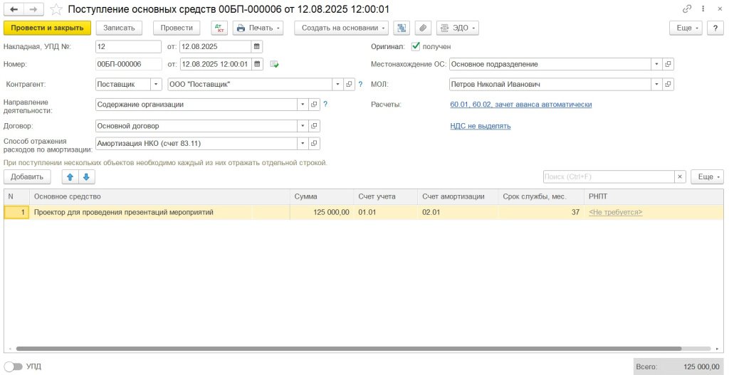- Стандартный способ – с помощью документов Поступление (акт, накладная) с видом операции Оборудование и Принятие к учету ОС. Применяется, когда основное средство требует дополнительных затрат (например, доставка, монтаж, пусконаладочные работы) или не готово к немедленной эксплуатации сразу после поступления. Первый документ отражает приход объекта на склад (счет 08), а второй – его ввод в эксплуатацию с учетом всех понесенных расходов.