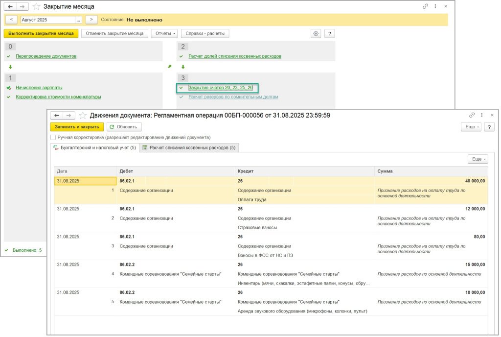 При закрытии месяца (раздел Операции − Закрытие месяца) собранные на счетах затрат расходы автоматически списываются на субсчета счета 86.02, сохраняя аналитику по направлениям деятельности: