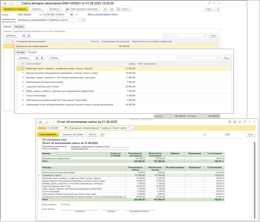 После освоения средств НКО должна отчитаться об использовании полученного финансирования. В программе для этого имеется Отчет об исполнении сметы.