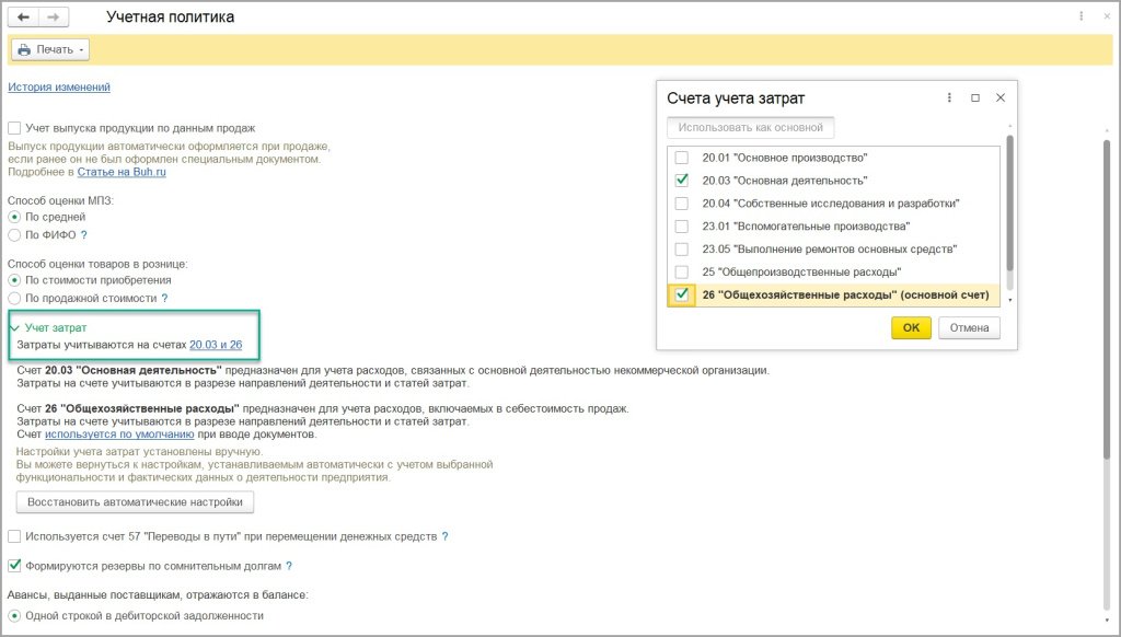 Для более детального контроля затрат дополнительно можно использовать счет 20.03 «Основная деятельность». В этом случае на счете 26 рекомендуем учитывать расходы на содержание организации, а на счете 20.03 – расходы на осуществление целевых мероприятий. При этом счет, выбранный основным, будет по умолчанию подставляться в документы затрат.