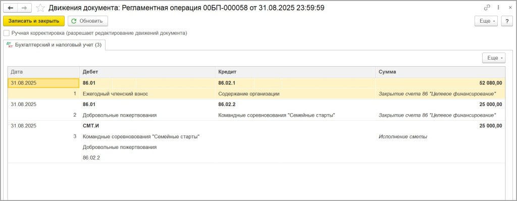 Далее в составе обработки Закрытие месяца выполняется регламентная операция Закрытие счета 86 Целевое финансирование, которая распределяет расходы на счете 86.02 между основаниями финансирования на счете 86.01. Если ведется сметный учет, то при закрытии месяца также учитываются заложенные в смету суммы расходов (вспомогательный счет СМТ.И «Сметы.Использование» определяет, что средства использованы для закрытия по смете).