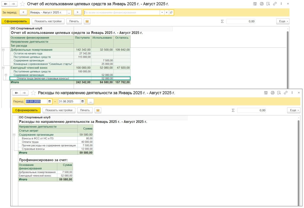 После закрытия месяца в программе можно сформировать отчеты донорам. Для этого используются отчеты Отчет об использовании целевых средств и Расходы по направлениям деятельности (раздел Деятельность – Отчеты).