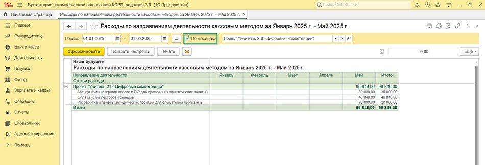 В программе можно сформировать аналогичный отчет методом начисления. Разница между ними в том, что показатели отчета по кассовому методу формируются на основании данных о движении денежных средств, что часто используется для отчетности перед донорами. А показатели отчета по методу начисления формируются после проведения документов поступления и расходования средств, независимо от оплаты.