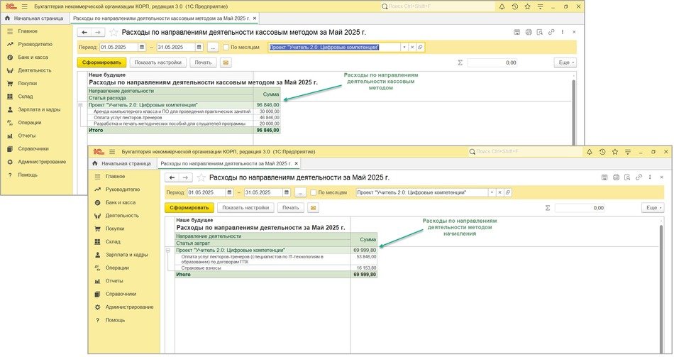 Рис. 10. Сравнение отчетов «Расходы по направлениям деятельности» кассовым методом и методом начисления
