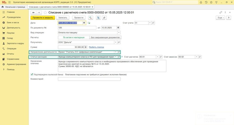 После включения функциональности в документах поступления денежных средств появится поле Направление деятельности.