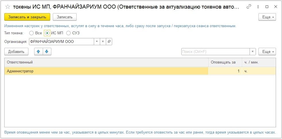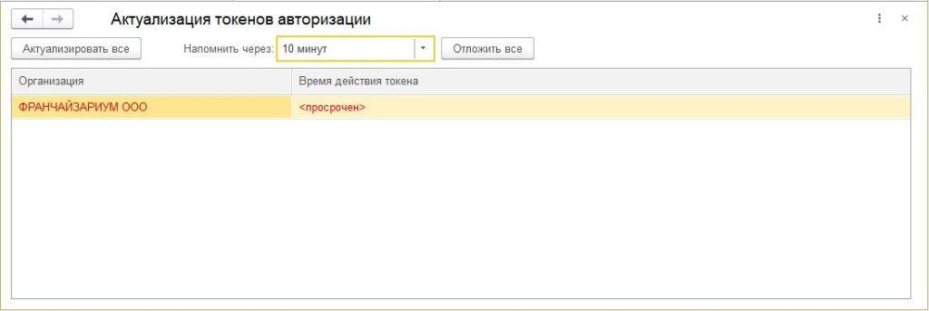 В настройке указывается время до окончания срока действия токена авторизации, за которое должно быть показано окно с оповещением ответственному за актуализацию.
