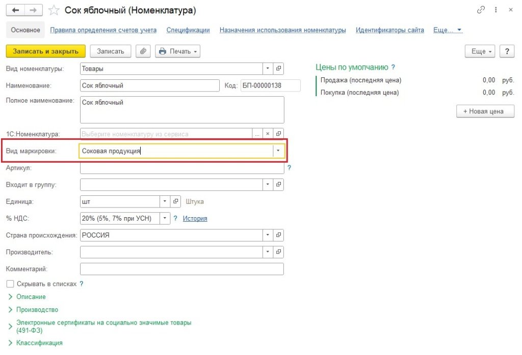 В карточке номенклатуры (раздел Справочники – Номенклатура) для маркируемого товара должен быть установлен Вид маркировки.