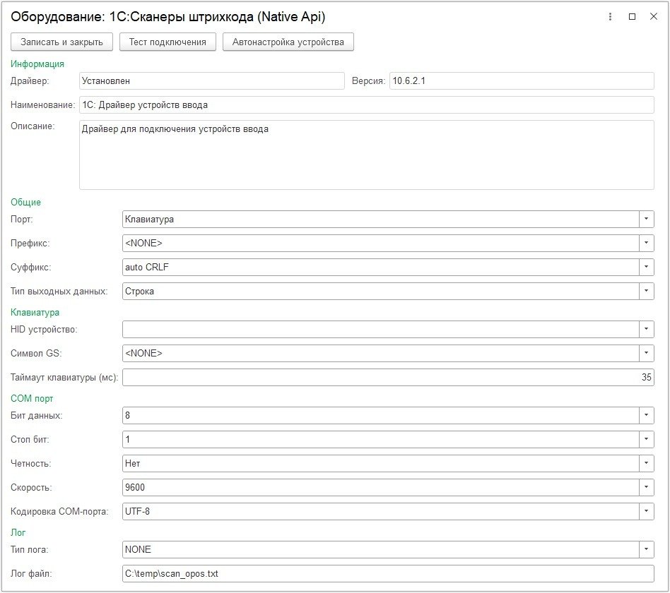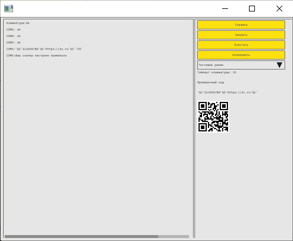 Для проверки правильности настроек нажмите кнопку Тест подключения. При правильной настройке сканера результатом должна быть строка с символами ’GS’. Если символов ’GS’ нет, то нужно проверить, что для сканера включена работа с кодами GS.
