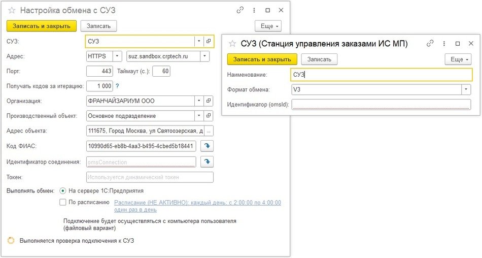 Настройка станции управления заказами (СУЗ) необходима производителям и импортерам маркируемой продукции для заказа кодов маркировки. Подключение к СУЗ выполняется в разделе Администрирование – Обмен с ИС МП (обувь, одежда, табак…) – Интеграция с ИС МП – Параметры подключения к СУЗ.