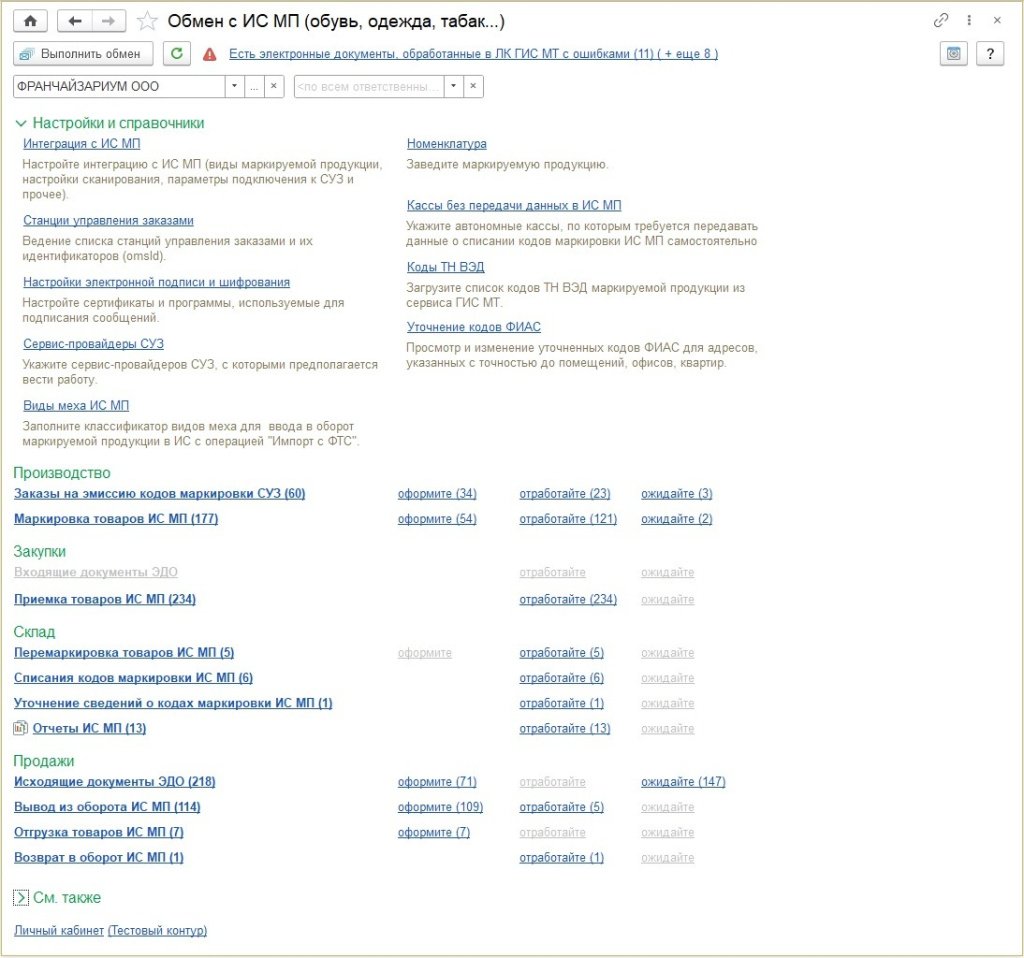 Рис. 2. Рабочее место «Обмен с ИС МП (обувь, одежда, табак…)»
