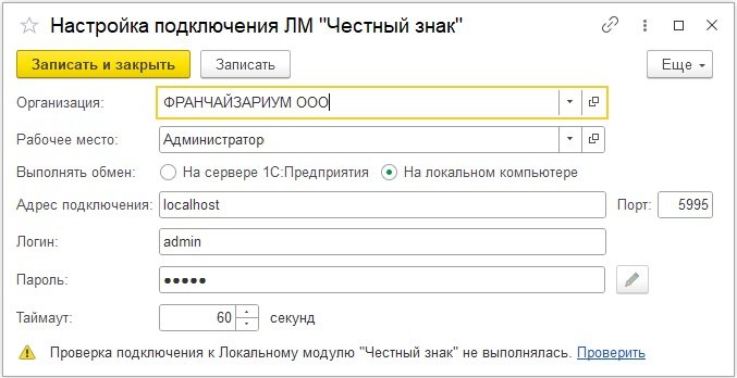 Рис. 8. Настройка подключения к ЛМ «Честный знак»