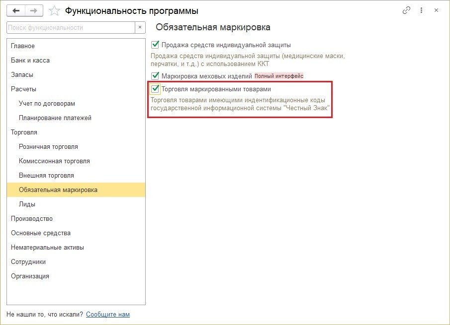 Рис. 1. Настройка функциональности программы для учета маркированных товаров