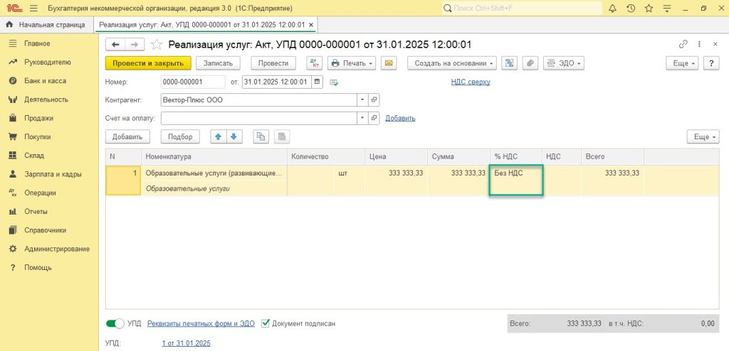 В документах реализации для необлагаемых товаров и услуг в поле НДС укажите Без НДС, рис. 3.