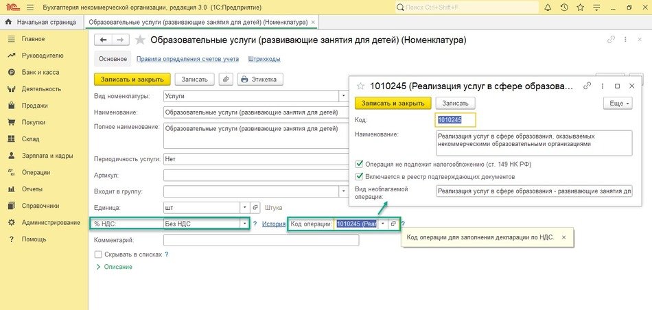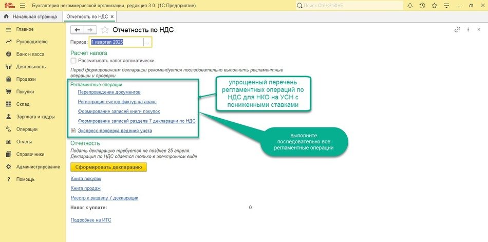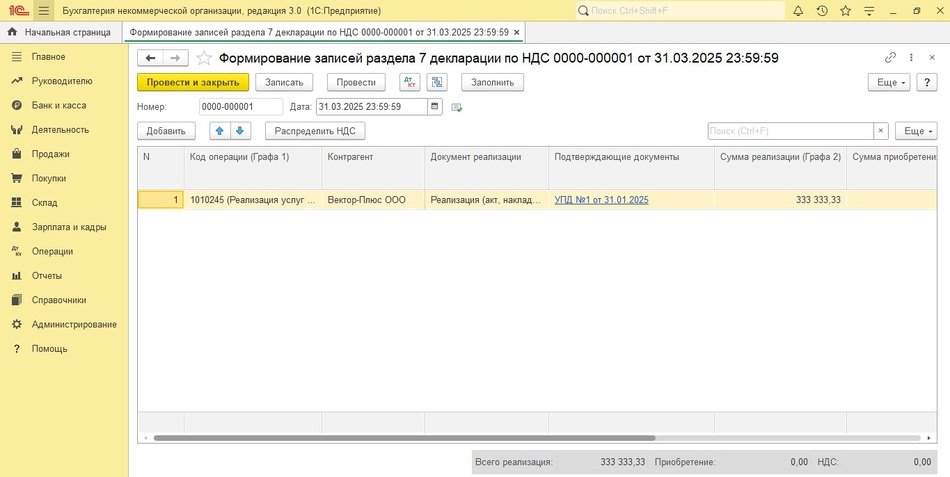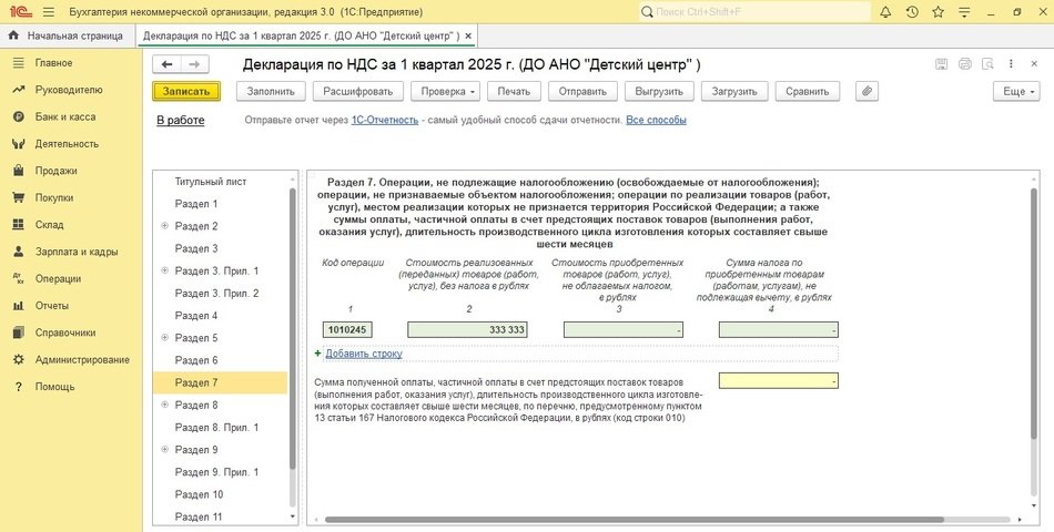 Для образовательных организаций на УСН, которые осуществляют подлежащие и не подлежащие налогообложению операции в «1С:Бухгалтерии НКО 8», поддержано автоматическое заполнение всех граф раздела 7 декларации по НДС. Для этого необходимо: