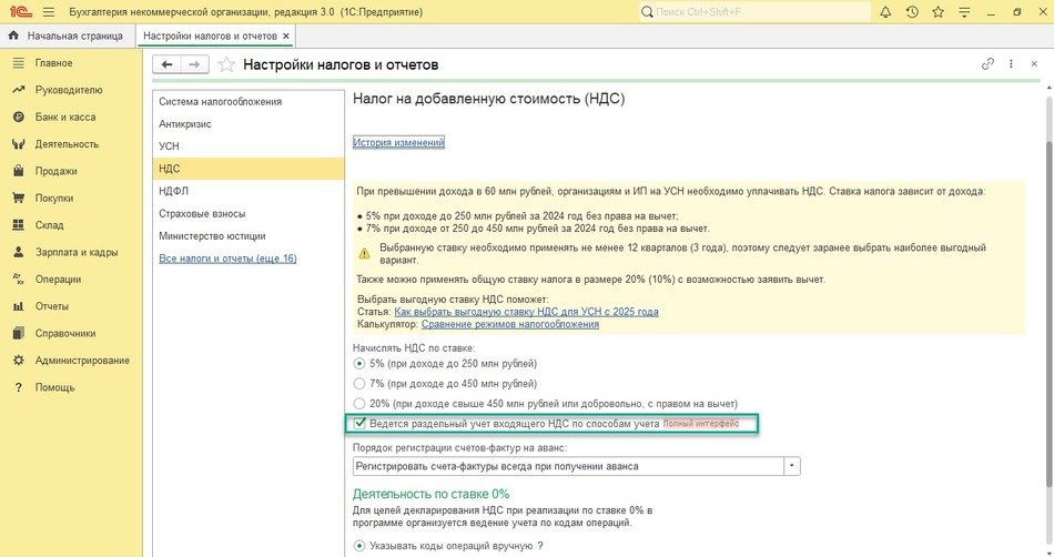 Для НКО на УСН, которые применяют пониженные ставки НДС, в ПРОФ версии имеется возможность вести раздельный учет входящего НДС упрощенным способом: