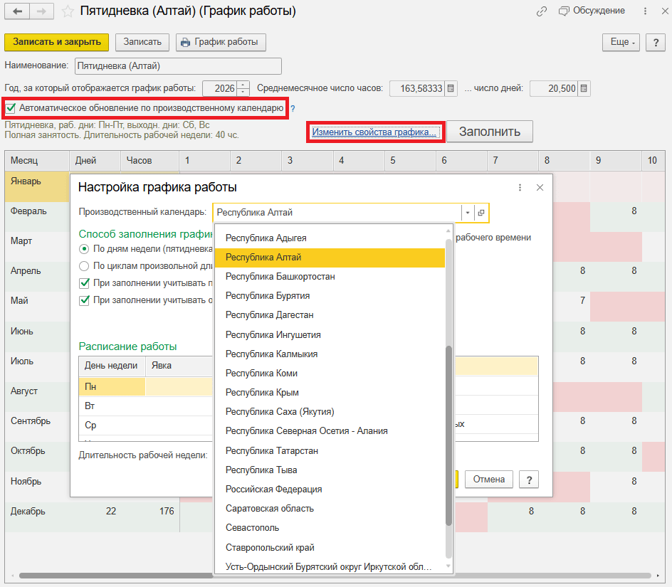 Рис. 2. Заполнение графика работы на 2026 год в программе «1С:Зарплата и управление персоналом 8» ред. 3
