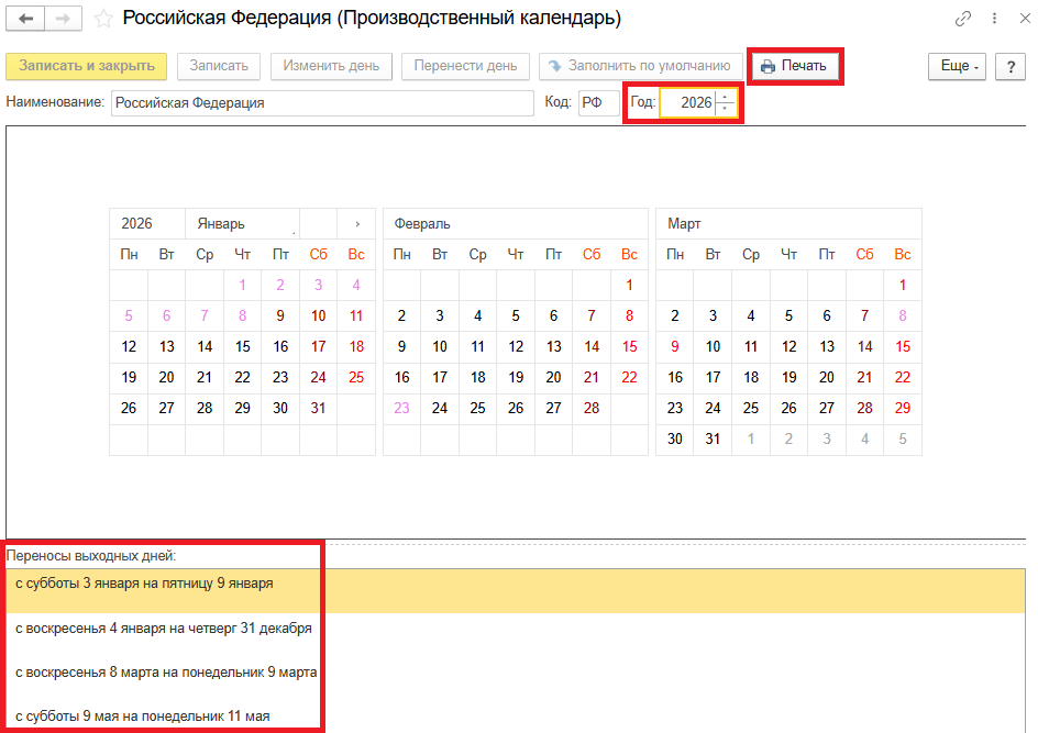 По кнопке Печать можно вывести печатную форму производственного календаря на 2026 год (рис. 1).