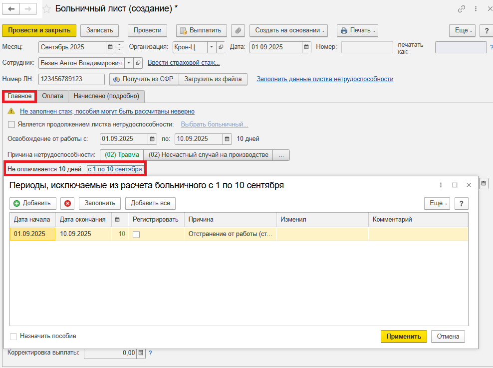 Для этого в документ Больничный лист (раздел Кадры или Зарплата) добавлено автоматическое отображение Простоя и заполнение Периодов простоя (или Периоды, исключаемые из расчета больничного).