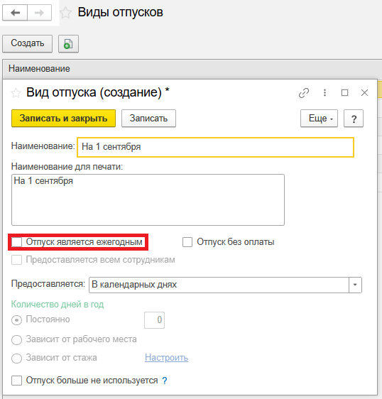 ❗ В карточке дополнительного вида отпуска «На 1 сентября» необходимо снять флаг Отпуск является ежегодным (рис. 1).