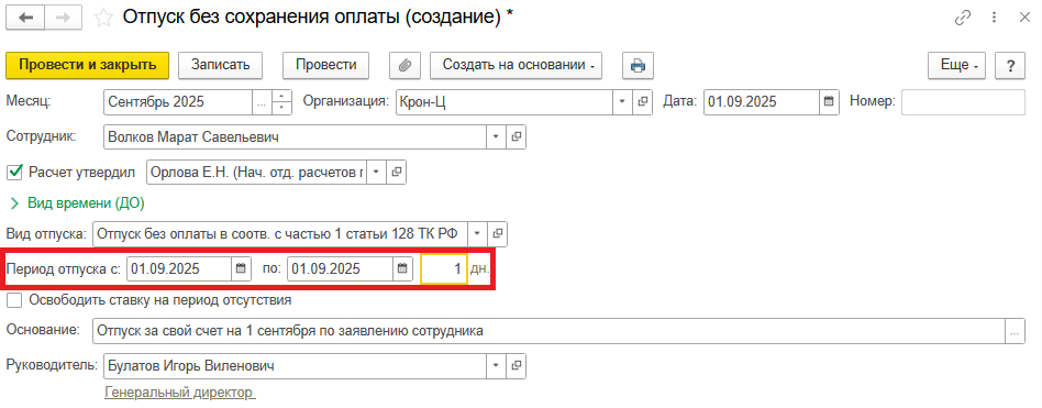 Для регистрации неоплачиваемого отпуска в документе Отпуск без сохранения оплаты следует указать период отпуска с 01.09.2025 по 01.09.2025 (рис. 2).