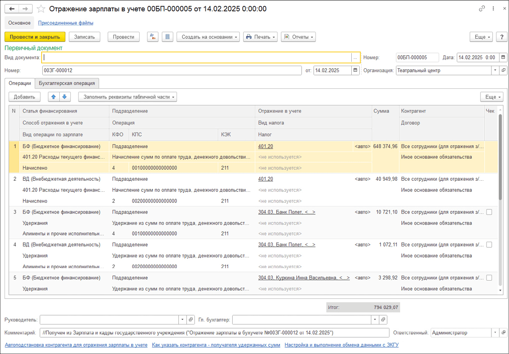 Отражение данных расчета в «1С:Бухгалтерии государственного учреждения 8»