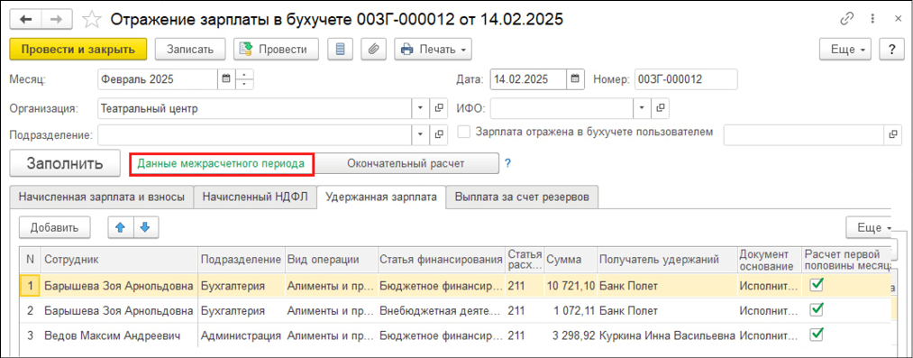 - Данные межрасчетного периода – в документ будут включаться результаты расчета первой половины месяца;