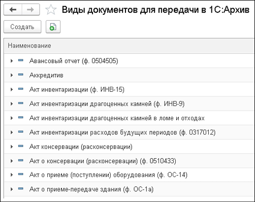Справочник Виды документов для передачи в 1С:Архив заполняется автоматически по данным БГУ о документах учета и печатных формах, а также по сведениям элементов справочника Виды отчетов для регламентированных бухгалтерских отчетов.