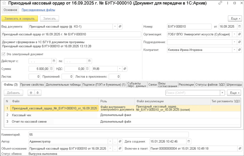 Кроме данных внутреннего или внешнего электронного документа в архив передаются присоединенные к документу или справочнику файлы.