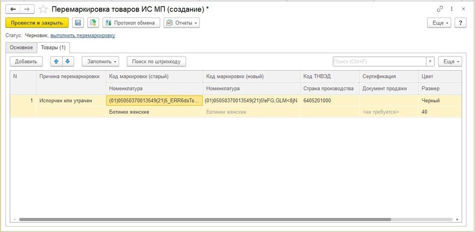 Для ввода новых кодов маркировки в оборот используйте документ Перемаркировка товаров ИС МП. Документ находится в разделе Администрирование – Обмен с ИС МП (обувь, одежда, табак...) – Перемаркировка товаров ИС МП.