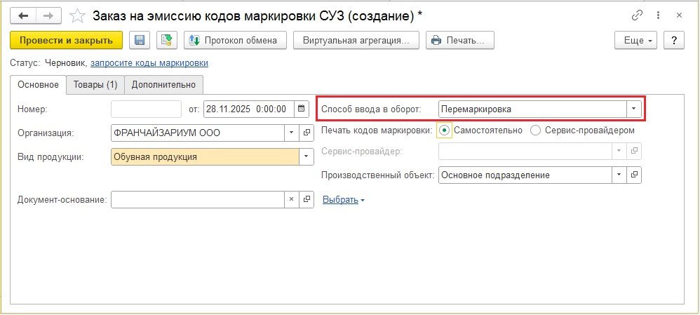 Рис. 1. Заказ кодов маркировки для перемаркировки