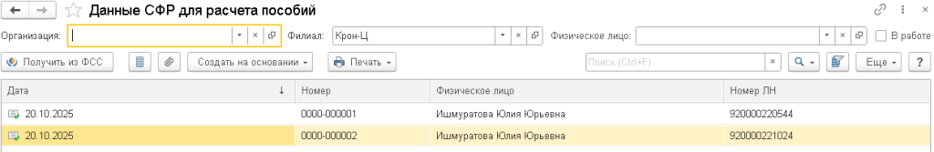 Рис. 3. Журнал документов «Данные СФР для расчета пособий» в программе «1С:Зарплата и управление персоналом 8» ред. 3