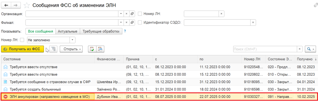 Рис. 1. Сообщения СФР об изменении ЭЛН в программе «1С:Зарплата и управление персоналом 8» ред. 3