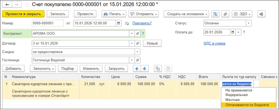 Теперь в документе Счет покупателю в поле Льгота по тур. налогу в списке доступных значений появилась новая льгота «Оплачивается из бюджета» (рис. 1).