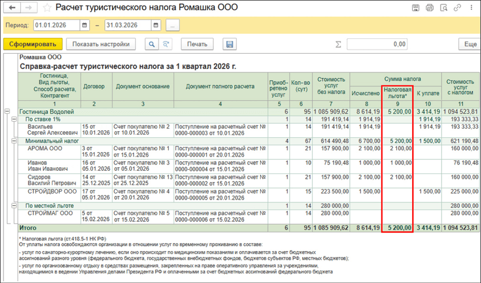 Рис. 2. Справка-расчет туристического налога с учетом новой льготы