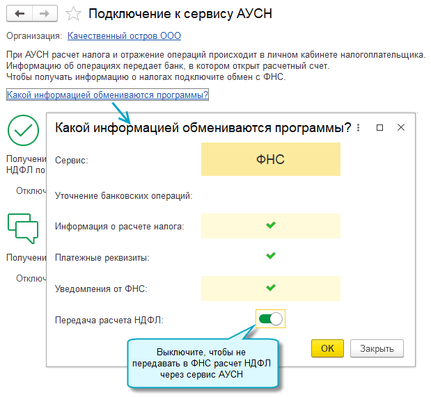 Налогоплательщик самостоятельно выбирает, через какой банк подавать сведения. В 1С для отправки расчета НДФЛ в банк (или напрямую в ФНС) необходимо в окне подключения сервиса 1С:АУСН перейти по гиперссылке Какой информацией обмениваются программы? и в открывшемся списке подключенных партнеров выбрать нужного, передвинув ползунок Передача расчета НДФЛ.