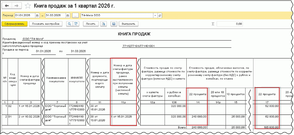 Таким образом, в книге продаж за I квартал 2026 года (рис. 6) будут зарегистрированы: