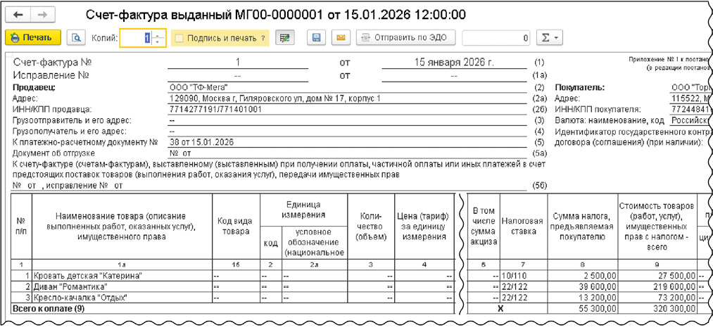 Рис. 5. Печатная форма счета-фактуры на реализацию товаров