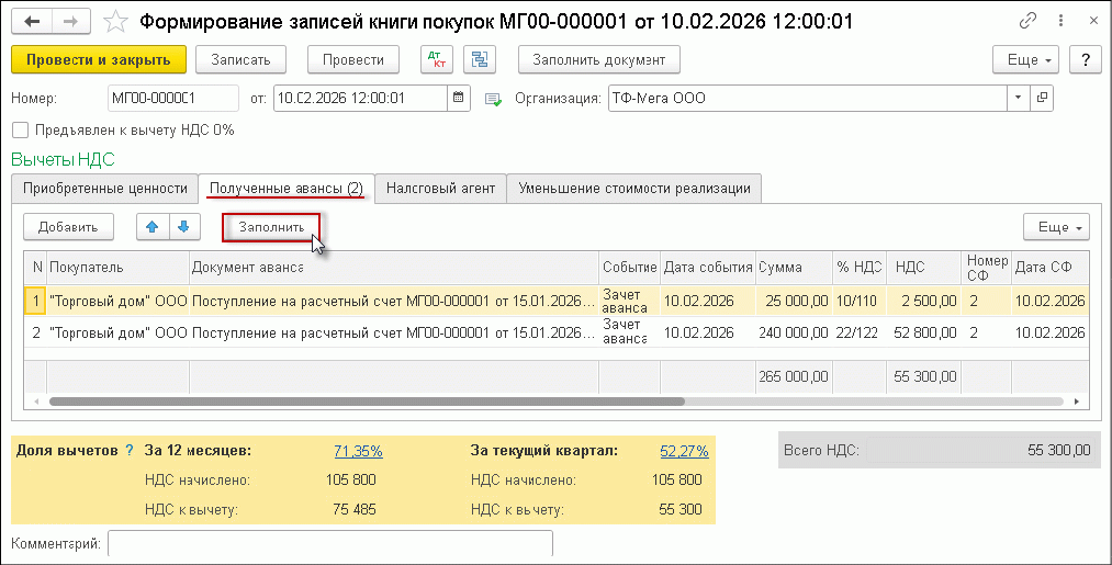 Автоматическое заполнение документа производится по кнопке Заполнить. На закладке Полученные авансы будут отражены сведения о поступивших суммах предоплаты и суммах НДС, исчисленных ранее с сумм полученных авансов и зачтенных в счет отгрузки соответствующих товаров.