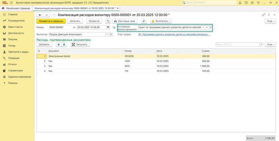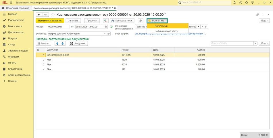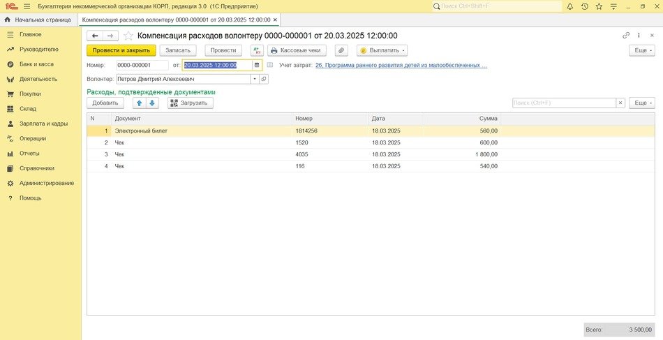 Отразить расходы волонтера, связанные с его деятельностью, можно с помощью документа Компенсация расходов волонтеру (раздел Деятельность – подраздел Волонтеры), рис. 3.