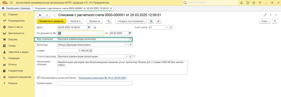 Рис. 8. Списание денежных средств с расчетного счета для компенсации расходов волонтеру