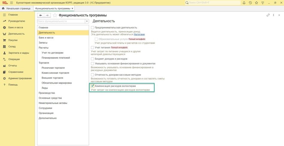 Чтобы была возможность компенсировать затраты волонтерам, необходимо включить данную функциональность в программе: раздел Главное – Настройки – Функциональность, на закладке Деятельность установить переключатель Компенсация расходов волонтерам (рис. 1).